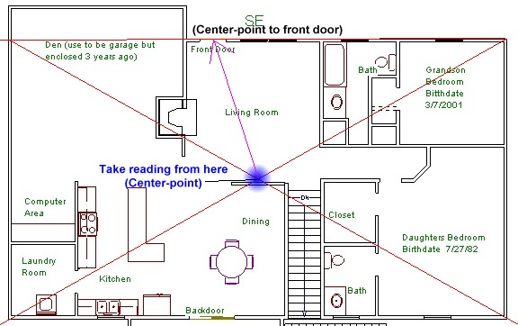 Try to take a compass reading from the center-point to your front door as shown under the file "upper level-centrepoint.jpg ".