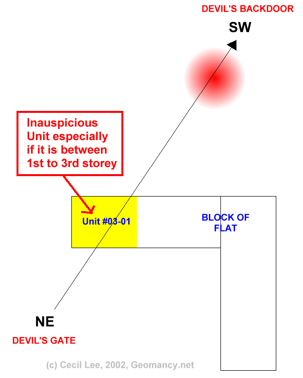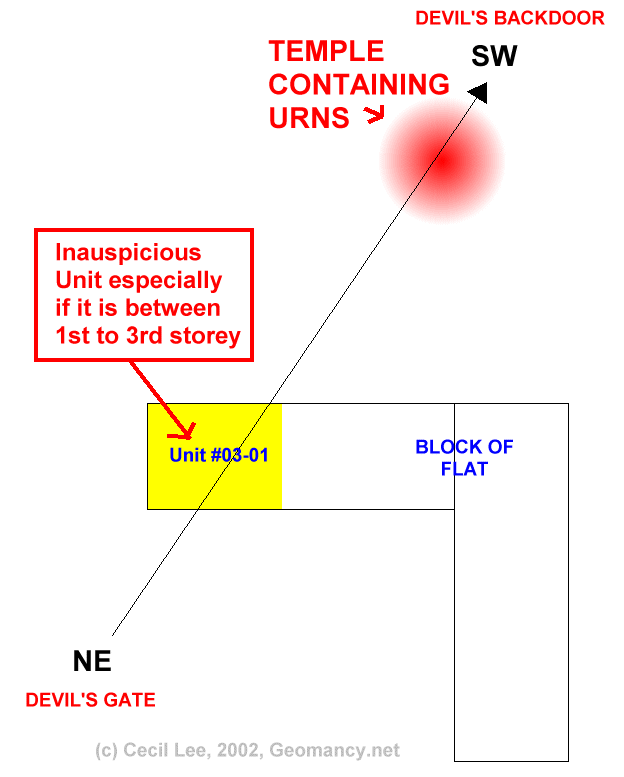 It is highly inauspicious to have a house situated at a NE to SW direction `cutting' to the temple. Especially if such temple has urns and in close proximity of 1 to 3 kilometres.