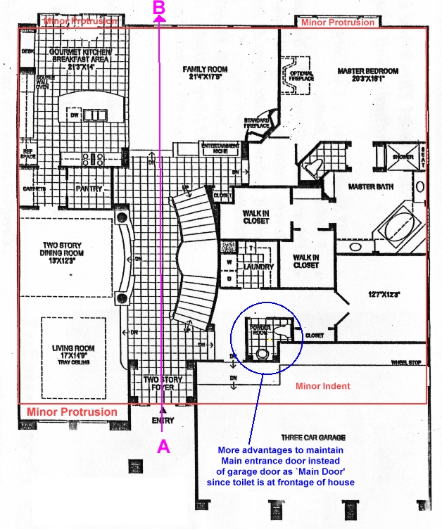 The main concern is the toilet at the frontage of the house. And this is where, you should not make the garage door as your symbolic main entrance door.
