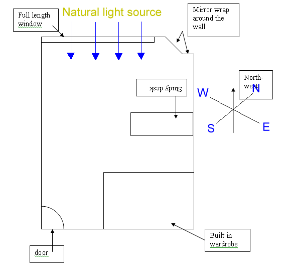 5. In your attached layout plan, it is not practical to study facing the sunlight or source of natural sunlight coming into the room. If your windows are exposed to direct sunlight, light filters from the West comes directly into your study room. This may result in having to draw the curtains especially if you are studying in the day.